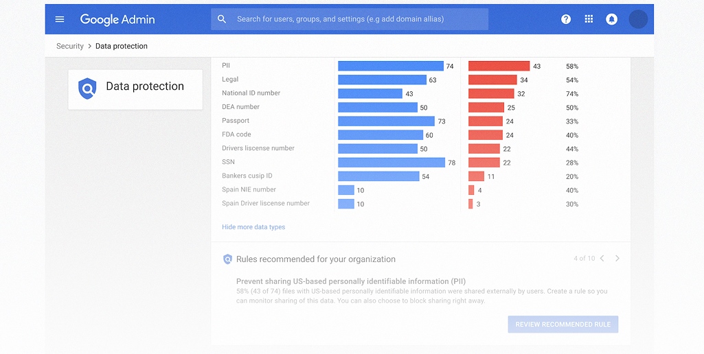 et pravila i kontrole koje sprečavaju neovlašćeno deljenje osetljivih podataka van firme ili čak unutar nje. Administratori postavljaju pravila, skenere sadržaja, izuzetke i akcije (blokiranje, karantin, upozorenje) npr. definisano pravilo da se u Gmailu ili Driveu ne šalju dokumenta koja sadrže brojeve kreditnih kartica, lične identifikacione podatke ili druge regulisane