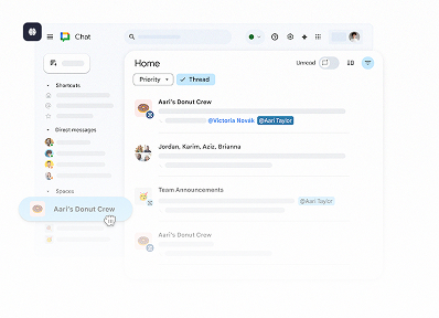Servis za timsku komunikaciju Podržava direktne poruke, “spaces” (prostorije / teme za razgovor), integraciju sa Drive/Docs/Sheets, deljenje fajlova unutar chatova, obaveštenja i saradnju među timovima.